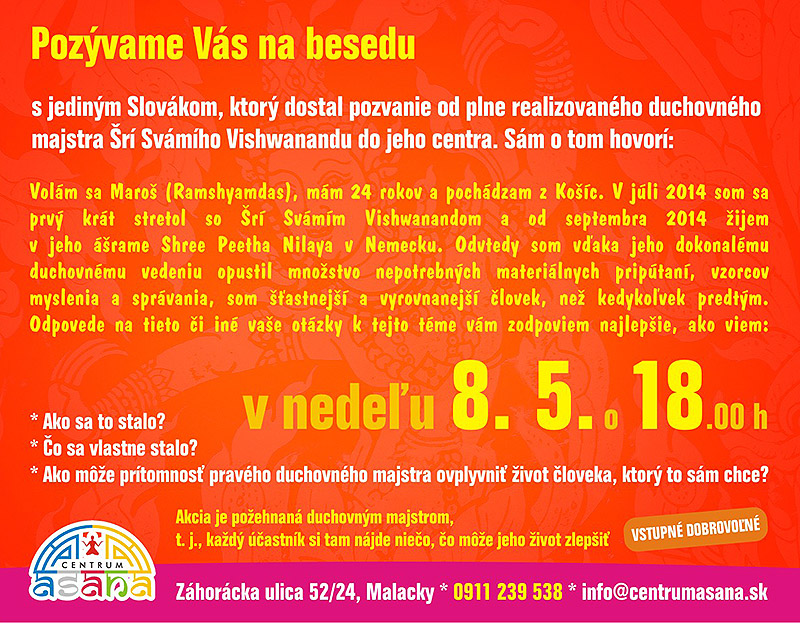 Beseda o duchovnom vedení, Ramshyamdas Mapa nie je dostupná Dátum/čas Date(s) - 08/05/201618:00 - 19:00 Kategórie Žiadne Kategórie